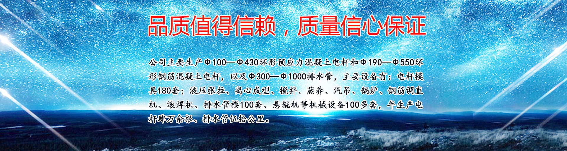 公司主要生產ф100—ф430環形預應力混凝土電桿和ф190—ф550環形鋼筋混凝土電桿,以及ф300—ф1000排水管,主要設備有:電桿模具180套;液壓張拉、離心成型、攪拌、蒸養、汽吊、鍋爐、鋼筋調直機、滾焊機、排水管模100套、懸輥機等機械設備100多套,年生產電桿肆萬余根、排水管伍拾公里?!?
